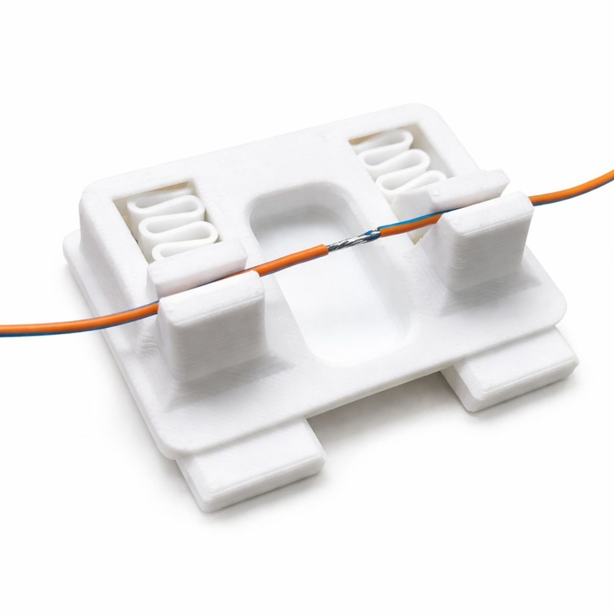 Pinças resistentes que seguram os fios com precisão.